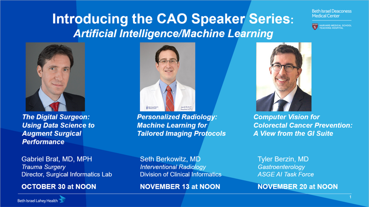The CAO Office will host a series of virtual events featuring investigators and clinicians using artificial intelligence and machine learning for research and patient care. This CAO Speaker Series will serve as a lead-in to the February 10, 2025, BILH-wide Symposium on Artificial Intelligence and Machine Learning.
